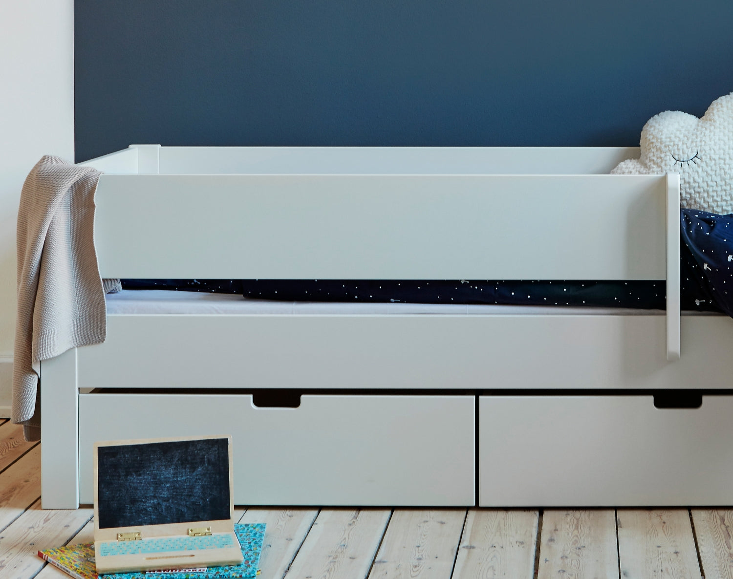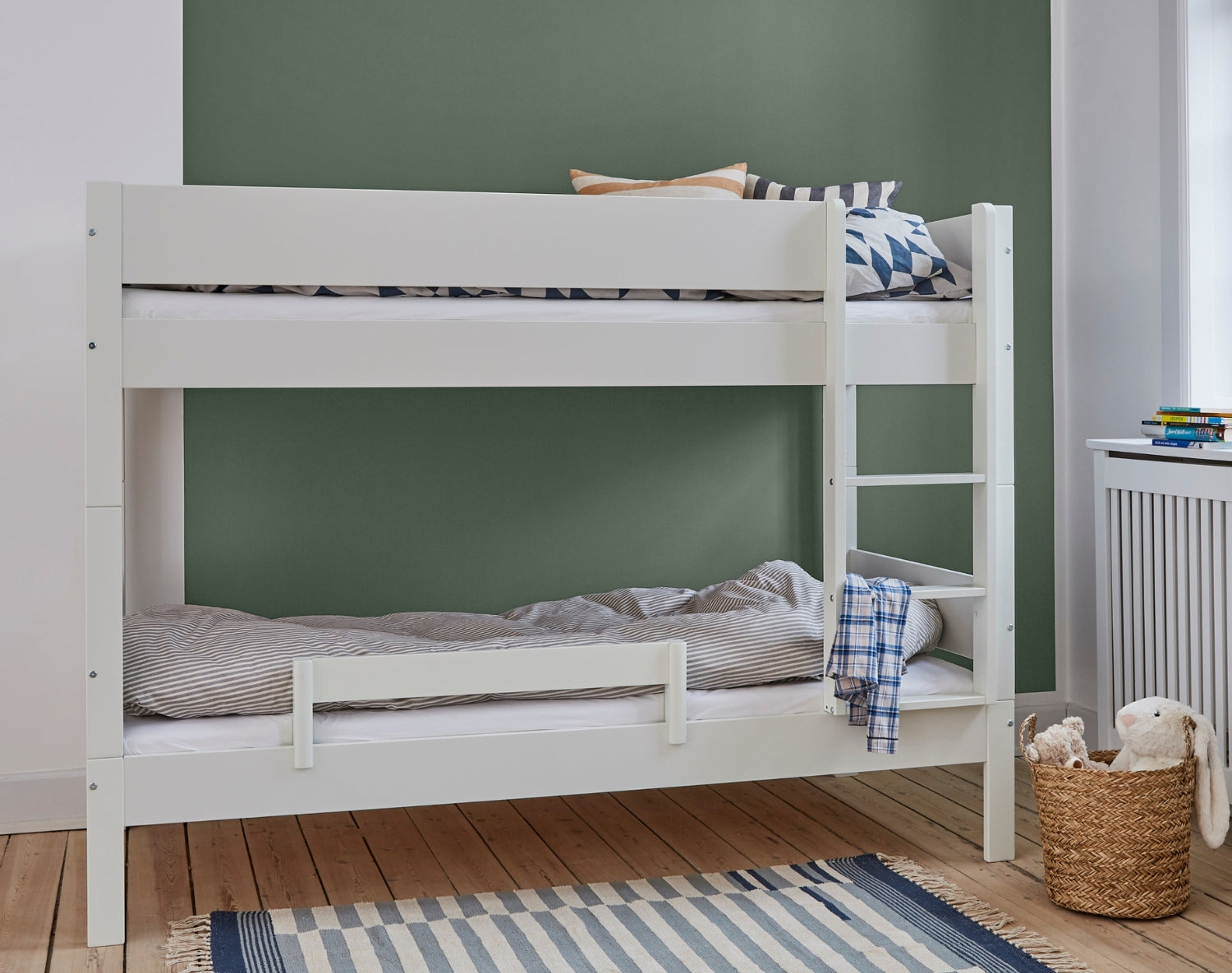Mit einem Huxie-Etagenbett müssen Sie sich keine Sorgen um Sicherheit oder Haltbarkeit machen. Die Betten wurden vom "Dänischen Technologischen Institut" nach den aktuellen europäischen Normen für Sicherheit, Materialien und Oberflächen geprüft und zugelassen. Die Bettpfosten bestehen aus massivem Buchenholz und sind mit umweltfreundlicher und unbedenklicher weißer Farbe lackiert. Die Bettseiten und Absturzsicherungen bestehen aus 19 mm starkem, lackiertem MDF.