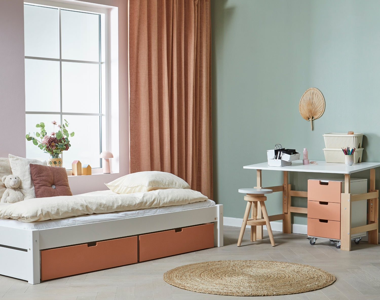 Ergänze das Zimmer mit praktischen Schreibtischen und Aufbewahrungselementen, damit der Raum auch im Alltag funktional und ordentlich bleibt.