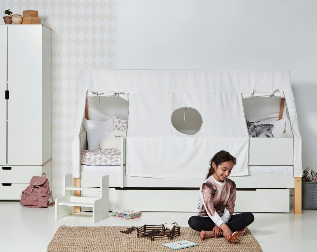 Fulla ist ein Hausbett mit Buchenrahmen und Baumwollhimmel, sodass Sie in Ihrem Bett einen gemütlichen Platz schaffen können. Das Bett ist in den Größen 160 cm und 200 cm erhältlich.