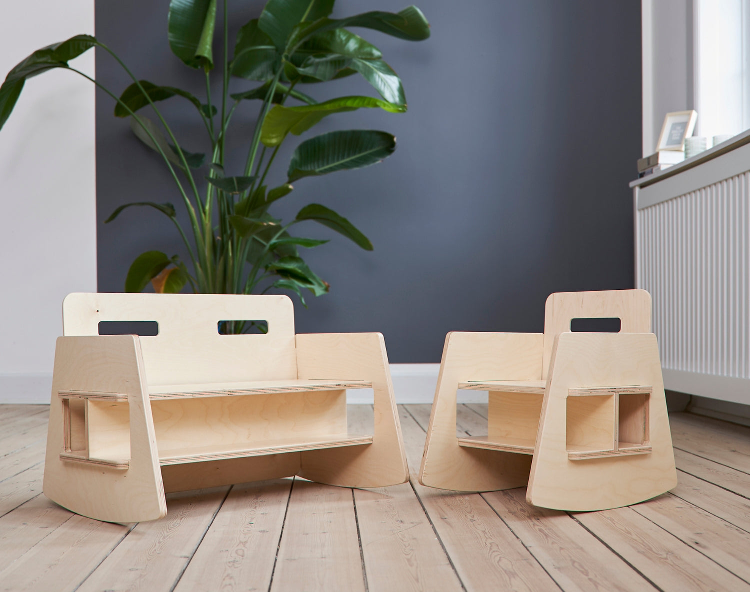 Der innovative Flip-Vip-Stuhl kann im Handumdrehen von einem normalen Stuhl zu einem Schaukelstuhl umgebaut werden – und ist auch als Bank erhältlich.