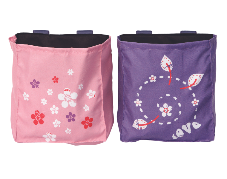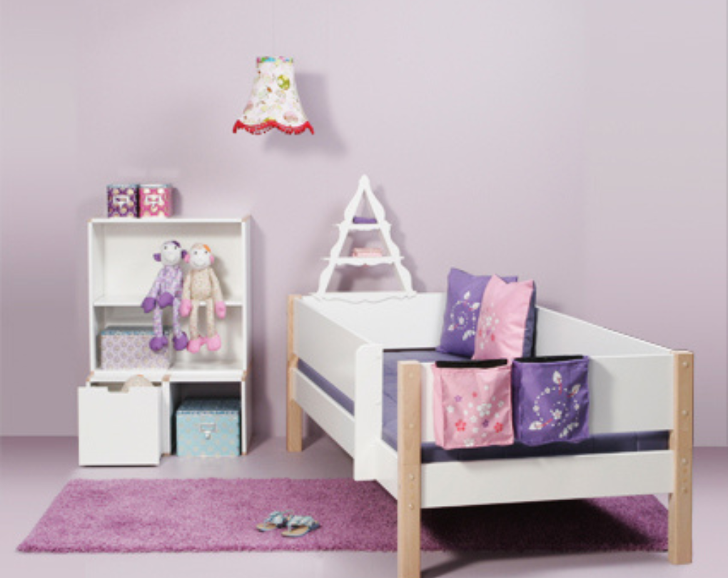 Rosa-lila Betttaschen mit süßem Blumen-/Love-Aufdruck. Die Betttaschen werden einfach mit Klettbändern befestigt – passend für Bettseiten, Kopfteile oder Bettgitter. Betttaschen sollten gereinigt werden.