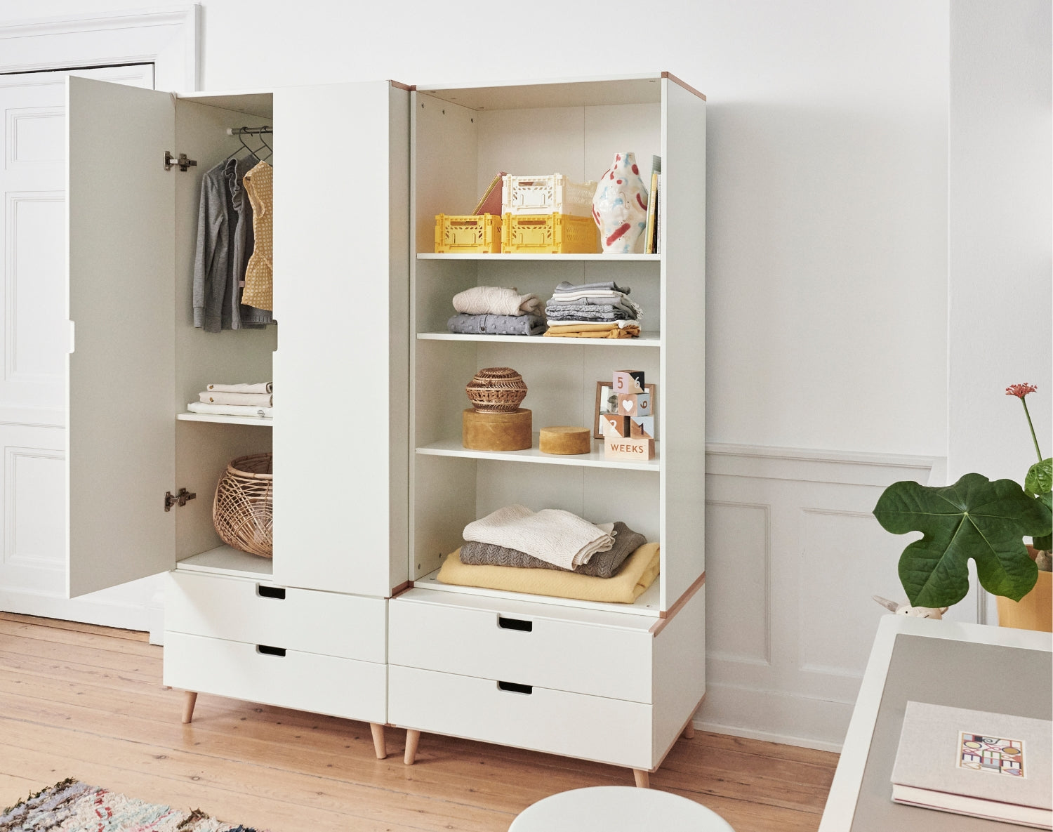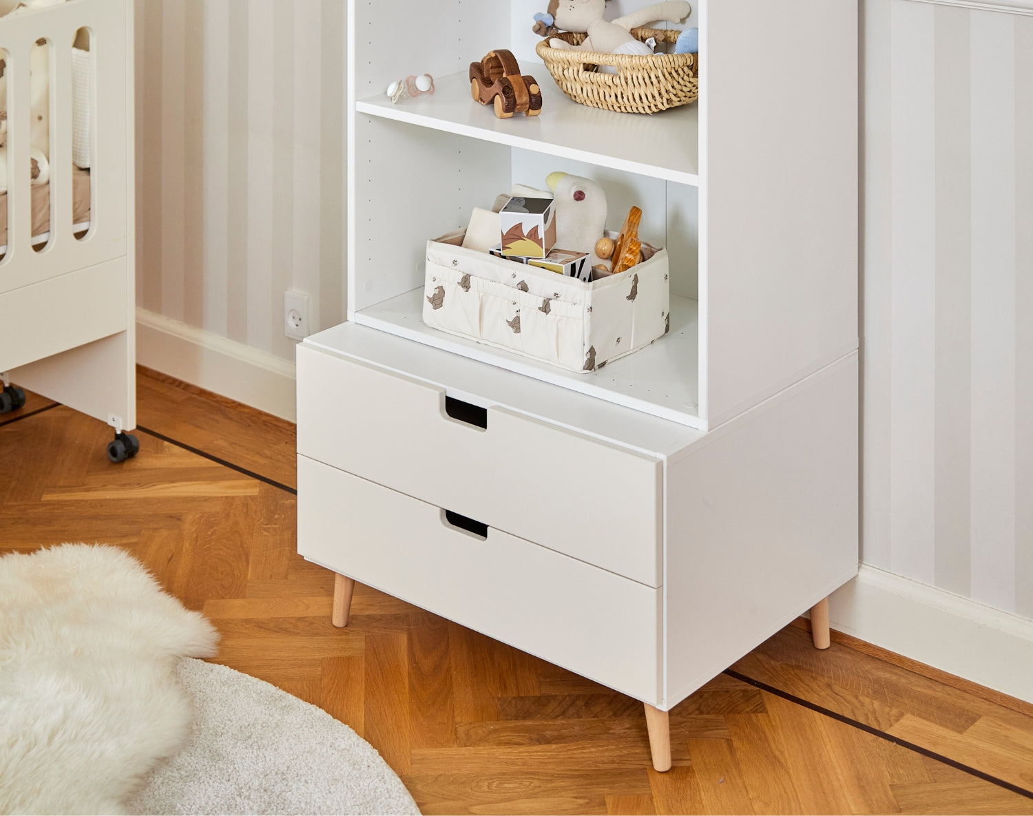 Die Beine bestehen aus massivem Buchenholz, das dem Interieur ein warmes und natürliches Finish verleiht. Das solide Material bietet Stabilität und Haltbarkeit für den täglichen Gebrauch – egal, ob die Möbel im Kinderzimmer, im Wohnzimmer oder im Flur stehen.