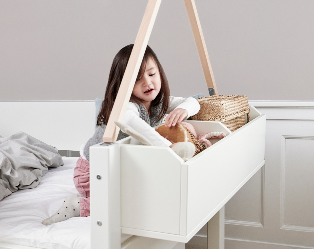Eine schlichte und zeitlose Aufbewahrungslösung, die perfekt in den Kinderzimmeralltag passt. Die Box lässt sich einfach seitlich oder vor dem Bett platzieren und bietet Platz für alles von Büchern und Teddybären bis hin zu kleinen Schätzen, die schnell griffbereit sein müssen.