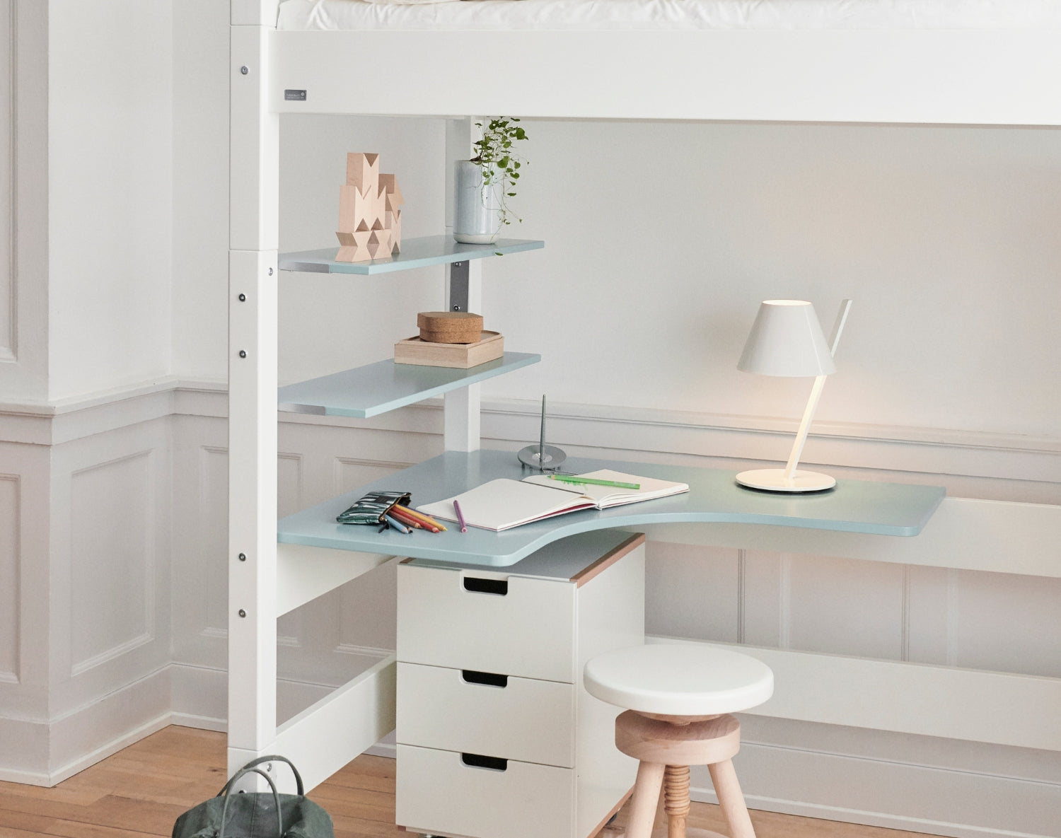 Bild kaufen – Gefion Hochbett mit "sky blue" Schreibtischplatte und Regalbretter