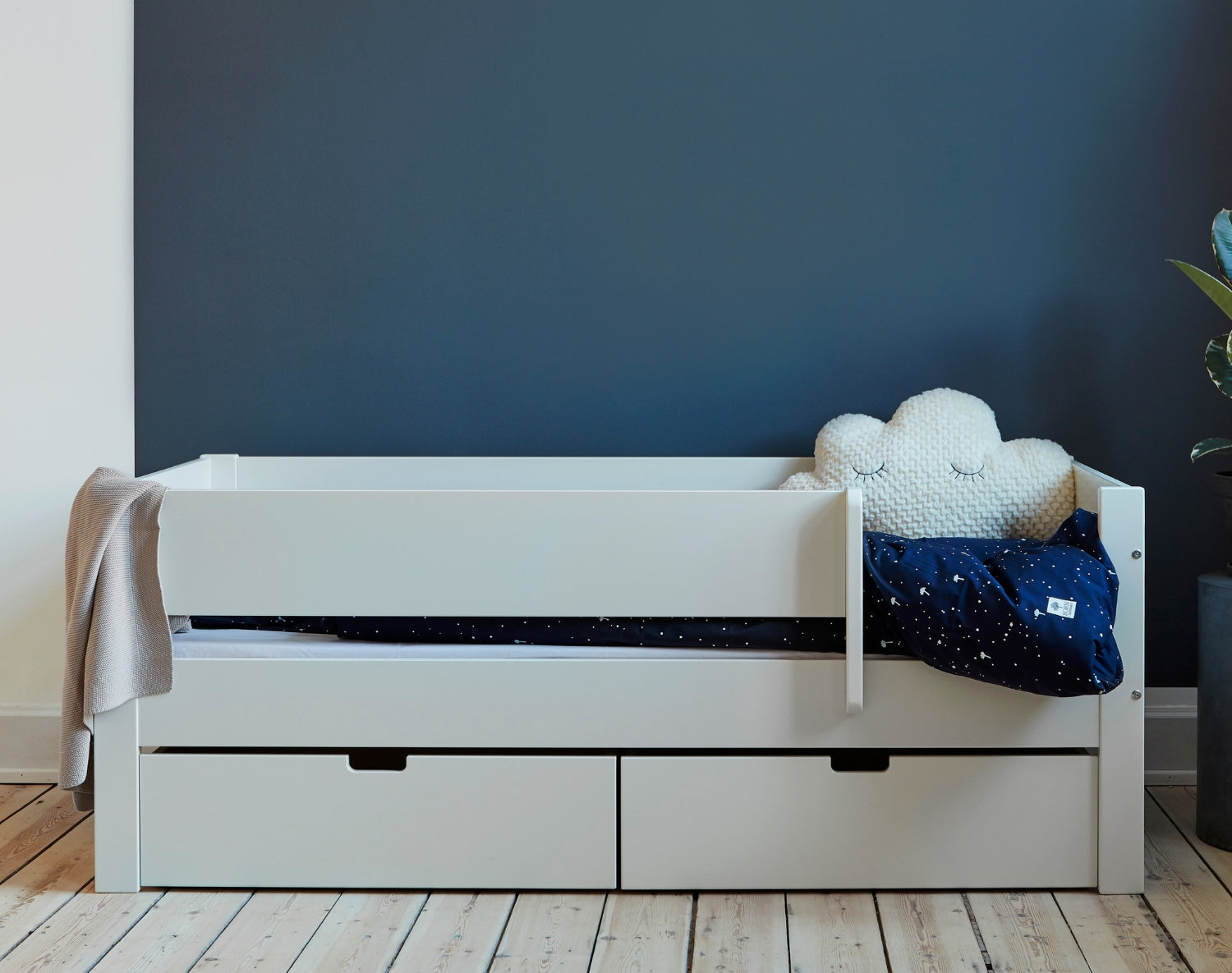 Dieses Bett ist ein guter Einstieg nach dem Babybett. Sie können einfach beginnen und haben dennoch die Möglichkeit, es bei Bedarf zu ändern. Das System ist einfach, sodass jeder das Bett problemlos beispielsweise in ein halbhohes Bett oder ein Etagenbett und wieder zurück umwandeln kann.