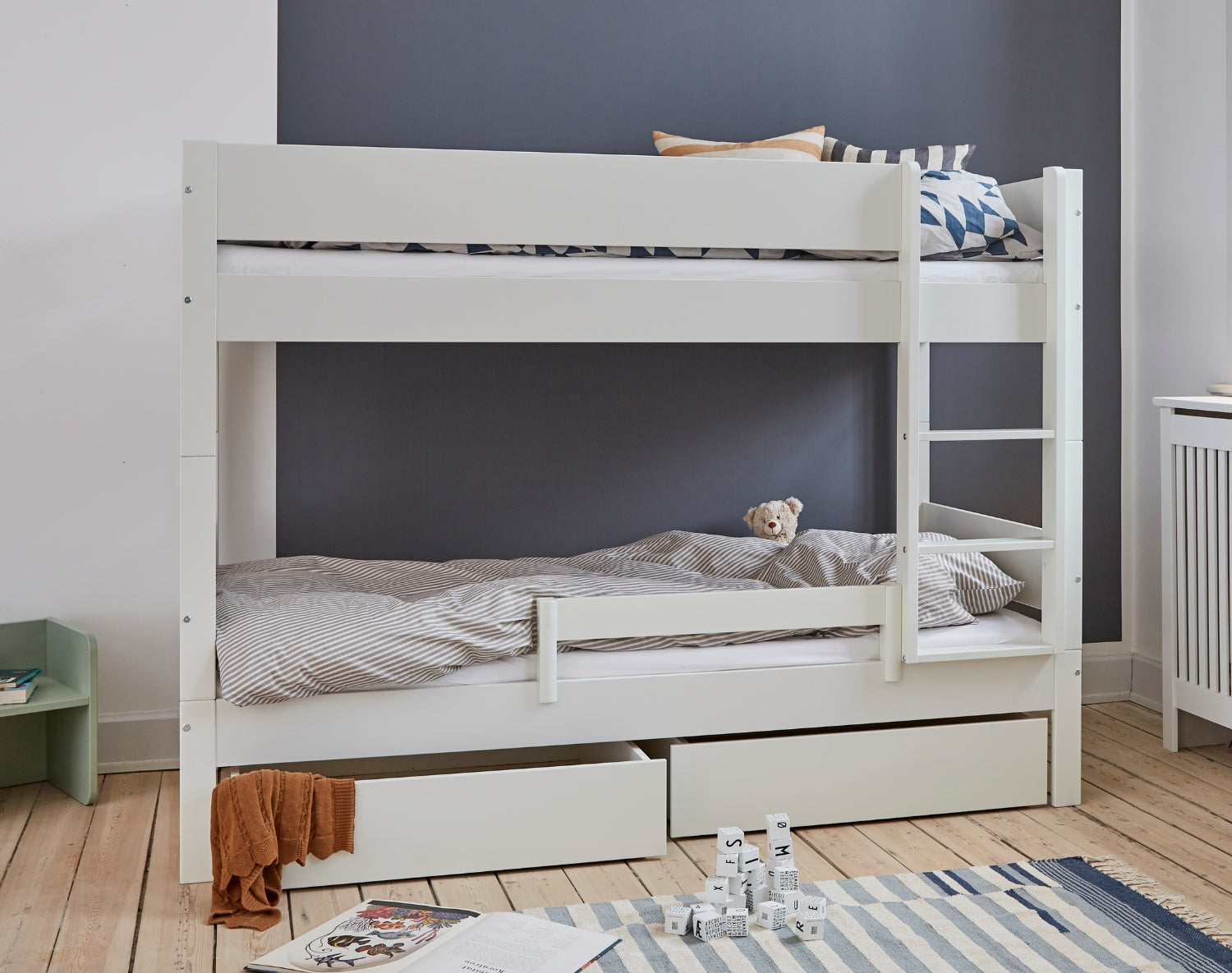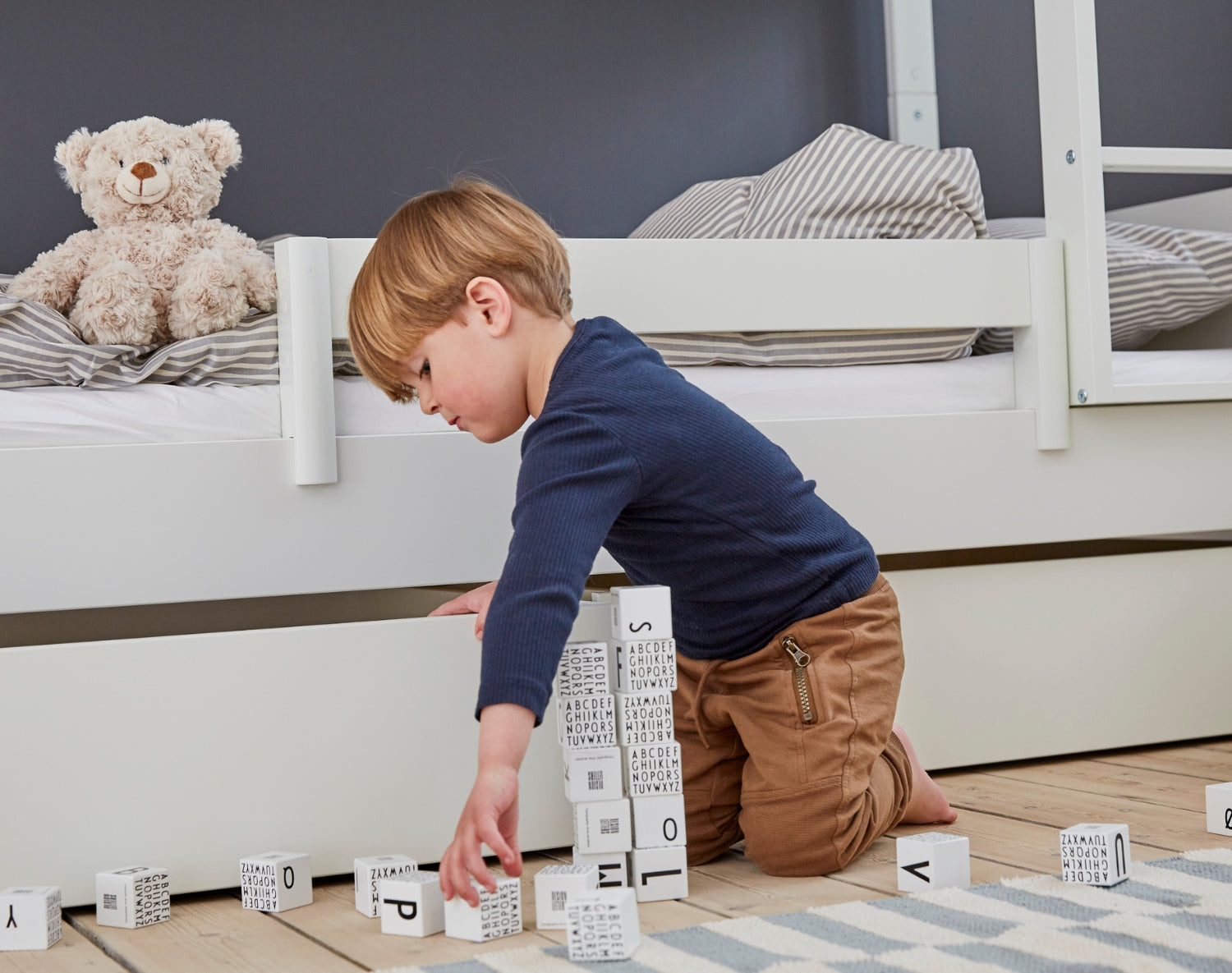 Mit diesem Bett haben Sie eine platzsparende Lösung mit zwei Schlafplätzen. Es gibt viel Platz zum Spielen und gleichzeitig ein sicheres und gemütliches Bett. Sie können einfach beginnen und haben dennoch die Möglichkeit, bei Bedarf Änderungen vorzunehmen. Das System ist einfach, sodass jeder das Bett problemlos beispielsweise in ein halbhohes Bett oder ein Etagenbett auf dem Boden umbauen kann.