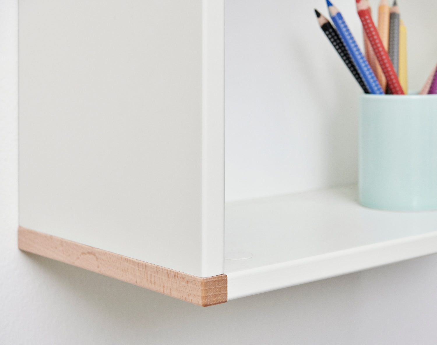 Das Regal ist optional mit einer farbigen Rückwand erhältlich, die eine persönliche Note verleiht. Die Rückwand kann umgedreht werden, sodass das Regal bei sich ändernden Wünschen wieder in einer neutralen Farbe erscheint.