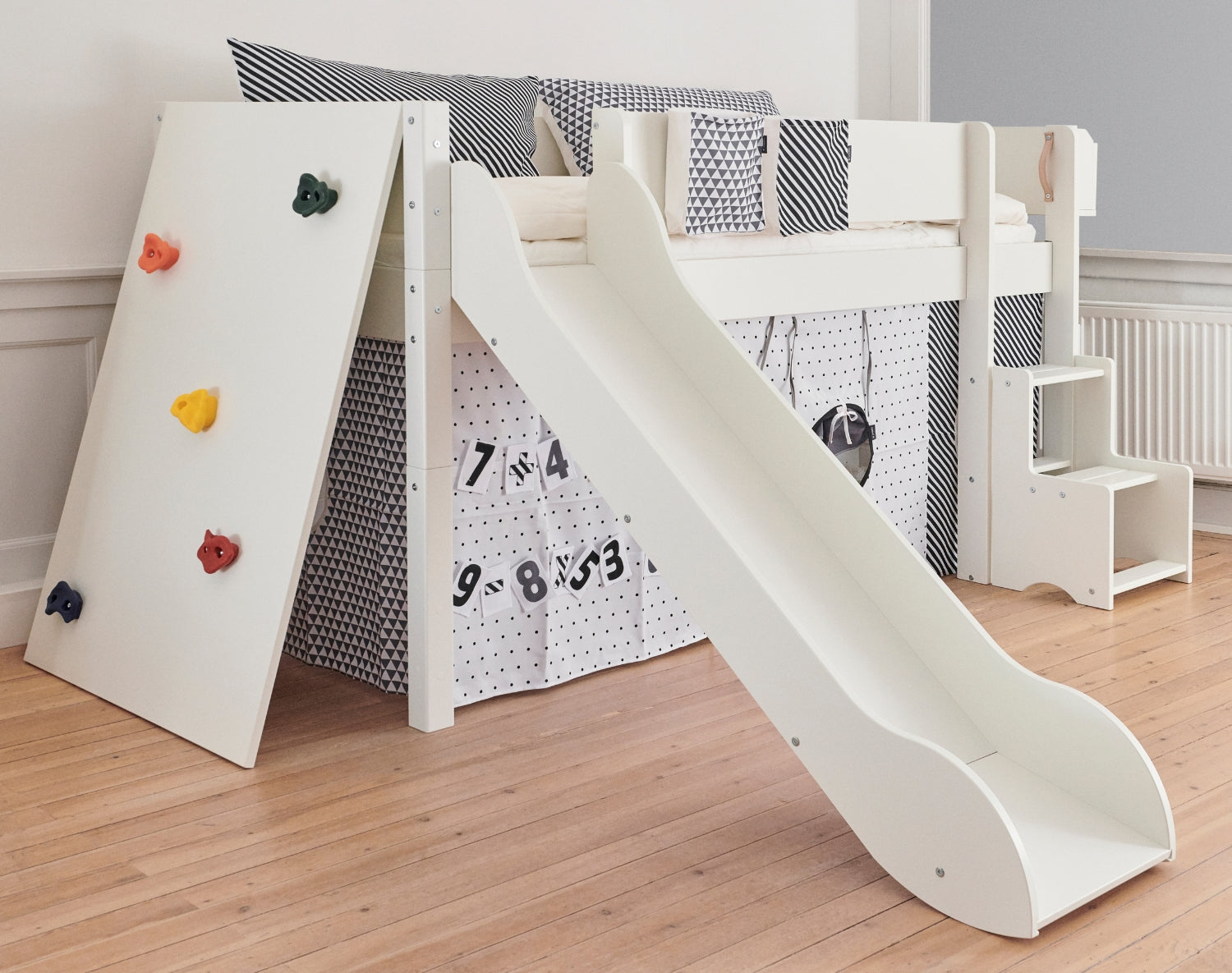 Loke ist ein halbhohes Bett mit Rutsche , das für Kinder entwickelt wurde, die Geschwindigkeit und Fantasie lieben – und für Eltern, die eine sichere, funktionale und schöne Lösung für ihr Kinderzimmer suchen. Es vereint Spiel und Schlaf in einem harmonischen Rahmen, in dem sich Ihr Kind frei und sicher fühlen kann.