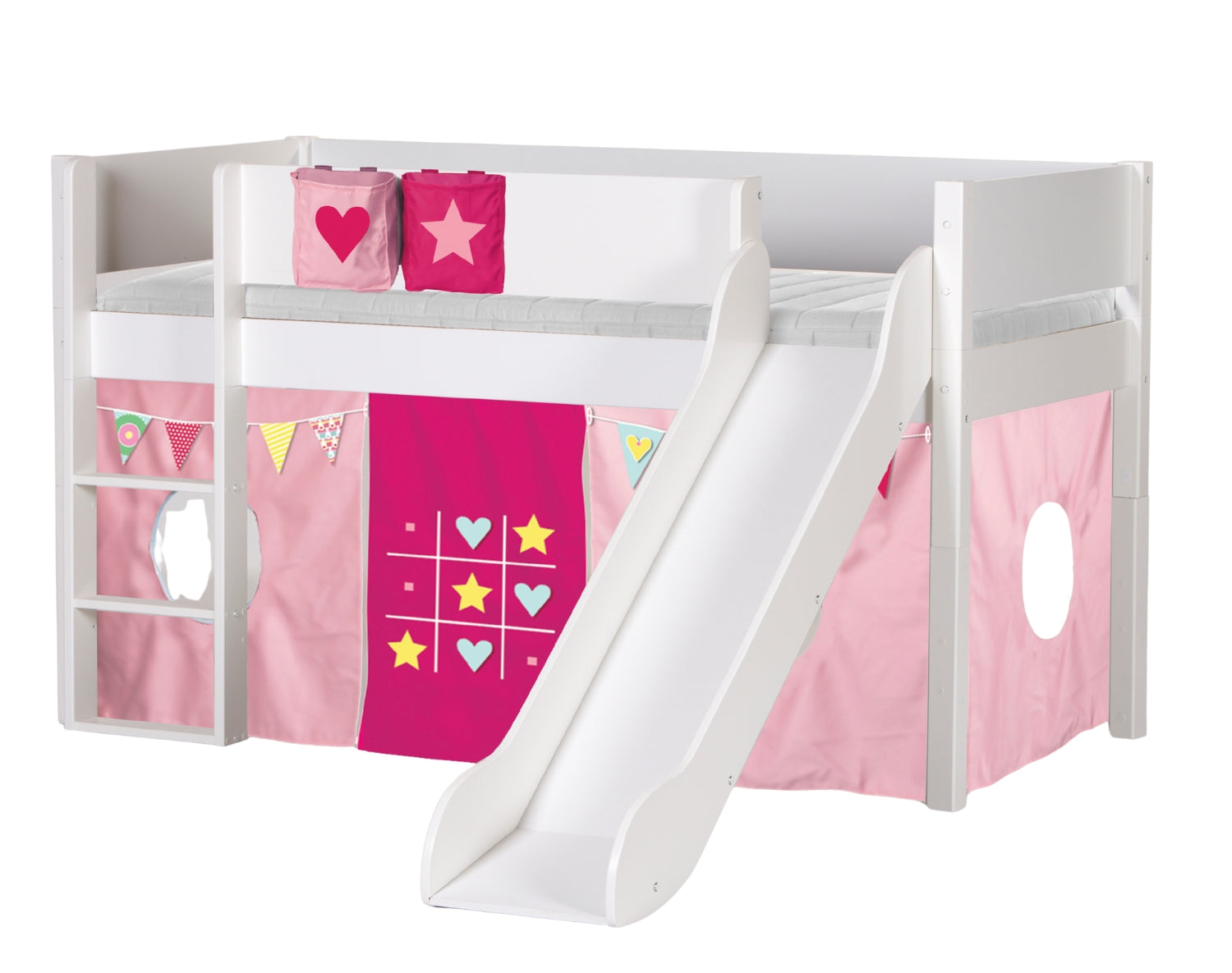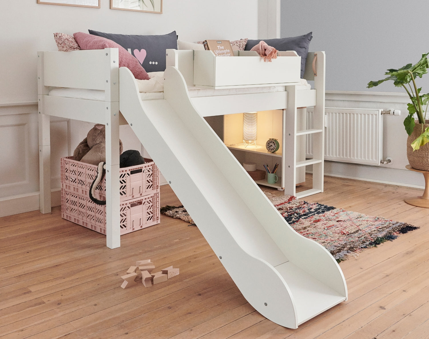 Wenn der Tag mit einer Rutschpartie beginnt, wird die Morgenroutine zum Spiel. Und abends findet man schnell wieder zur Ruhe – sicher umgeben von hohen Bettgittern, die einen gerahmten und sicheren Schlafplatz schaffen. Unter dem Bett entsteht ein kleiner Freiraum zum Höhlenbauen, Rollenspielen oder einfach zum ruhigen Vertiefen in Bücher und Teddybären.