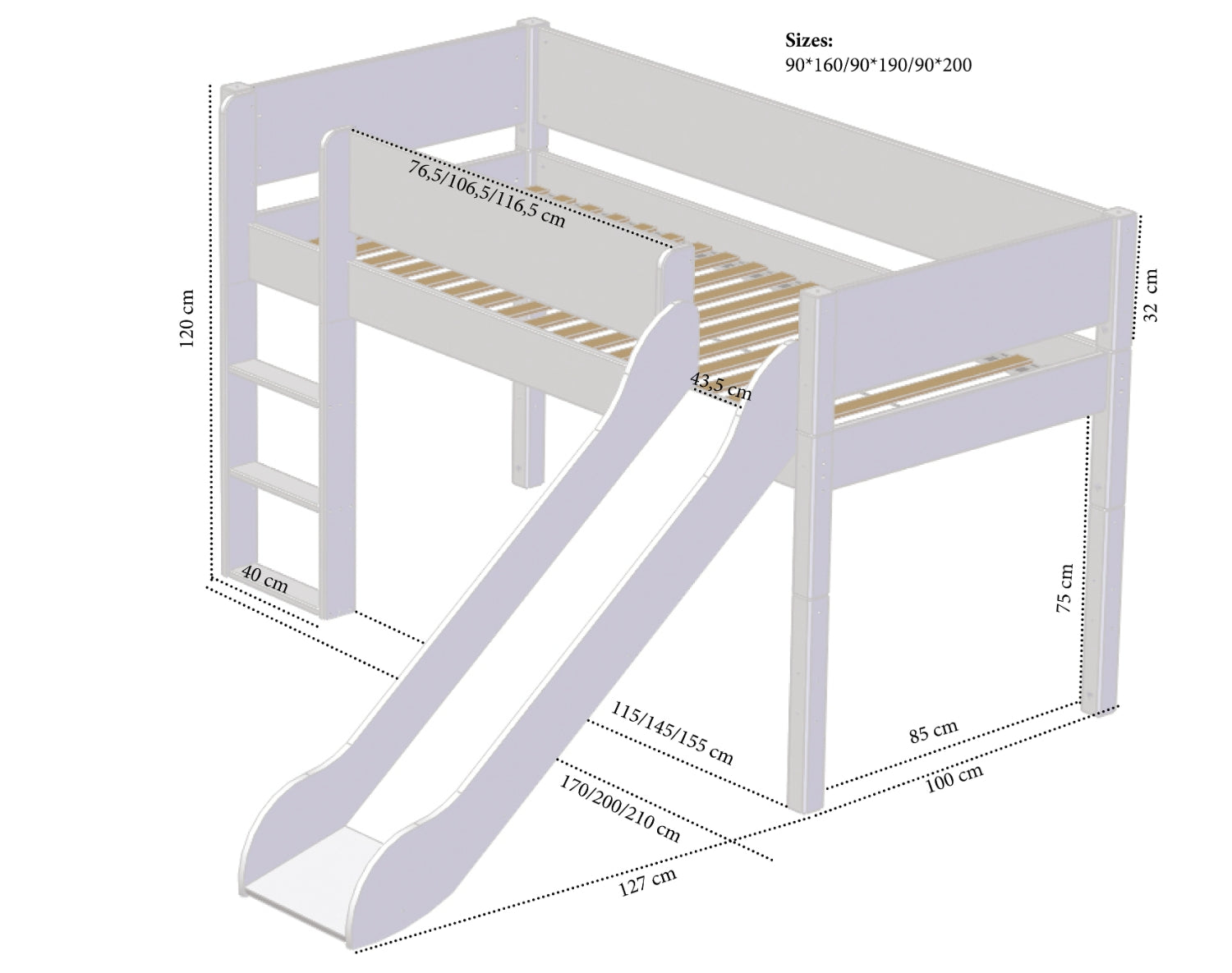 Loke ist in drei Längen erhältlich – 160 cm, 190 cm und 200 cm – und Sie können wählen, wo Sie die Leiter und die Rutsche haben möchten – ganz wie es zu Ihrer Einrichtung passt. Das Bett wird mit einem Bettgitter geliefert, bei dem Sie zwischen drei schönen Designs wählen können, sodass der Ausdruck zu Ihrem Stil passt.