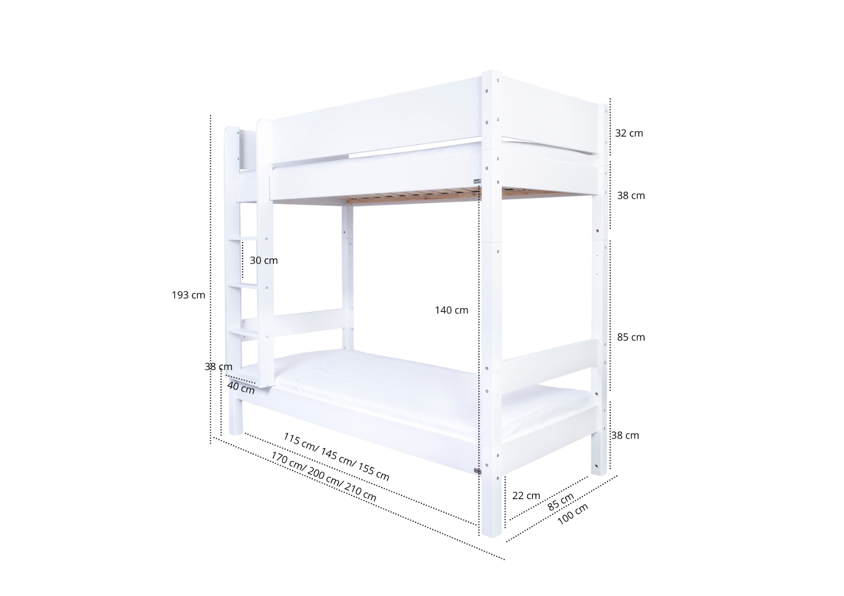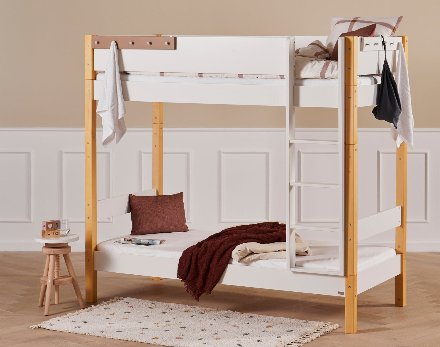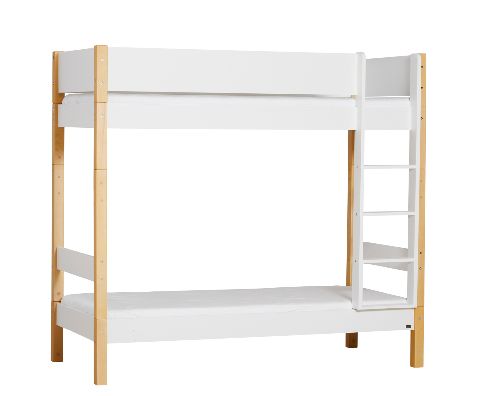 Maia ist ein extra hohes und elegantes Etagenbett – ideal für Familien, die mehr Luft zwischen den beiden Etagen und zusätzlichen Platz für Geschwister oder Freunde wünschen, die über Nacht bleiben. Die hohe Konstruktion verleiht dem Kinderzimmer ein helles und geräumiges Aussehen.