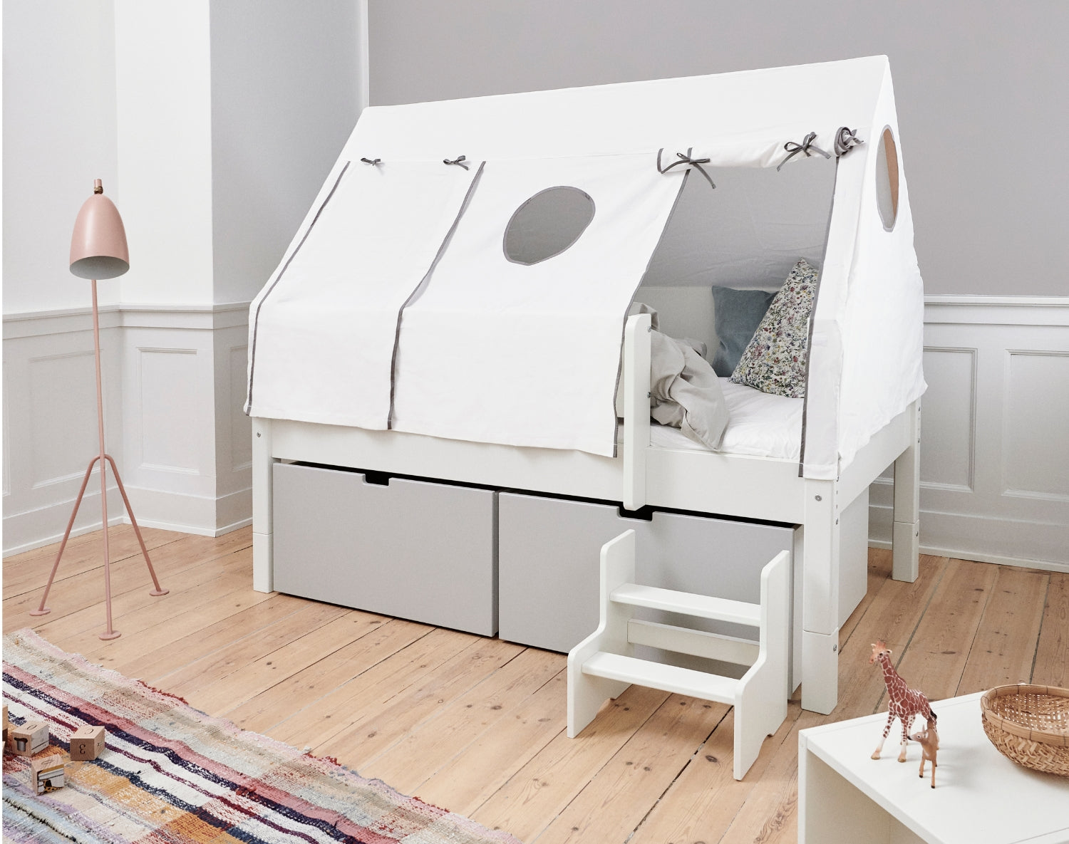 Sie können auch einen Rahmen aus Buche erwerben, der dem Bett ein warmes und natürliches Aussehen verleiht – und mit einem Hausbettmodul können Sie das Nanna-Bett ganz einfach in ein gemütliches und fantasievolles Hausbett verwandeln, das zum Spielen und Ruhen einlädt.