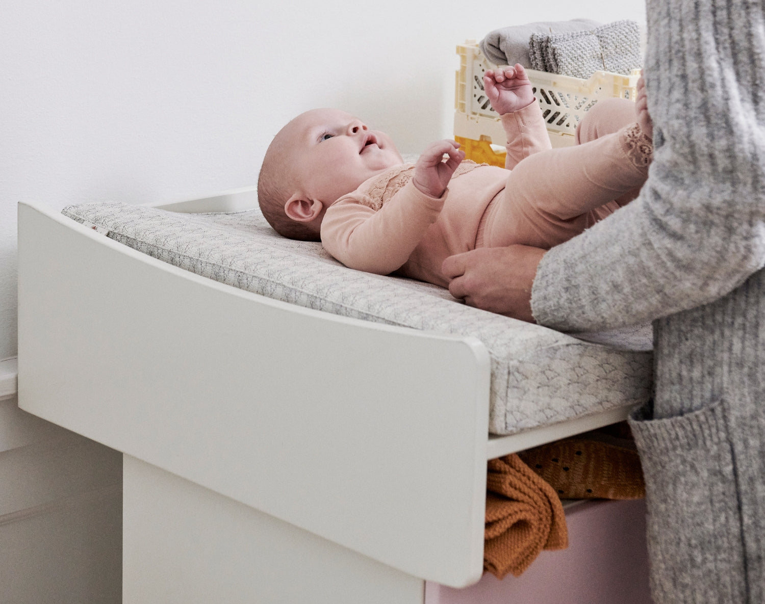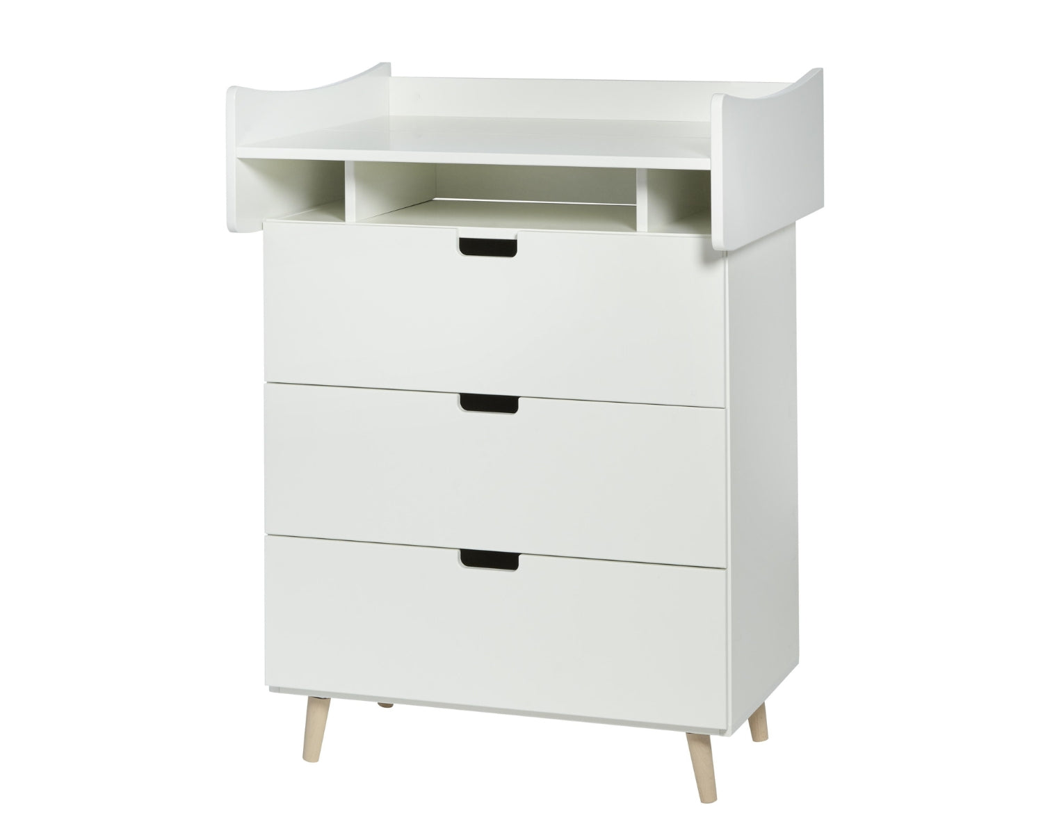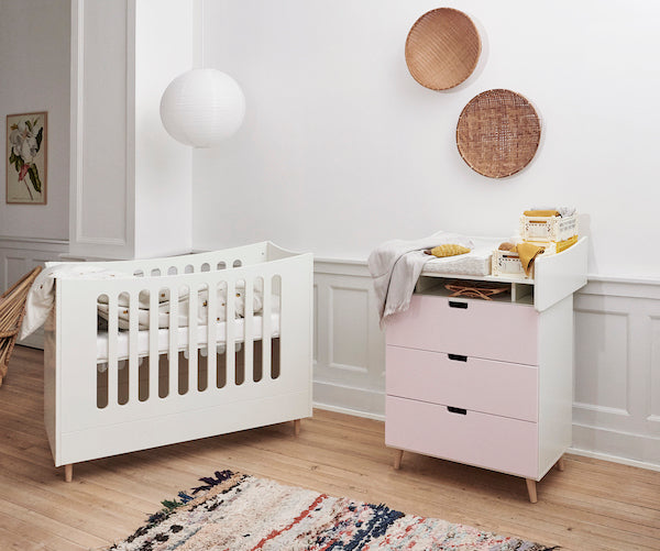 Die Wickeltischplatte bietet viel Platz zum Wickeln und hinterlässt beim Abnehmen keine Spuren. So kann die Kommode auch dann noch selbstständig als Aufbewahrungsmöbel im Kinderzimmer genutzt werden, wenn das Kind aus dem Wickeltisch herausgewachsen ist.