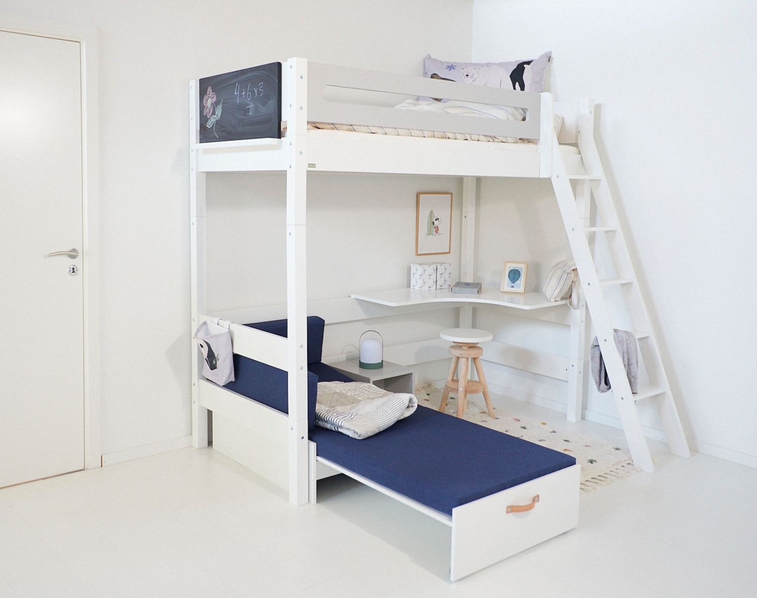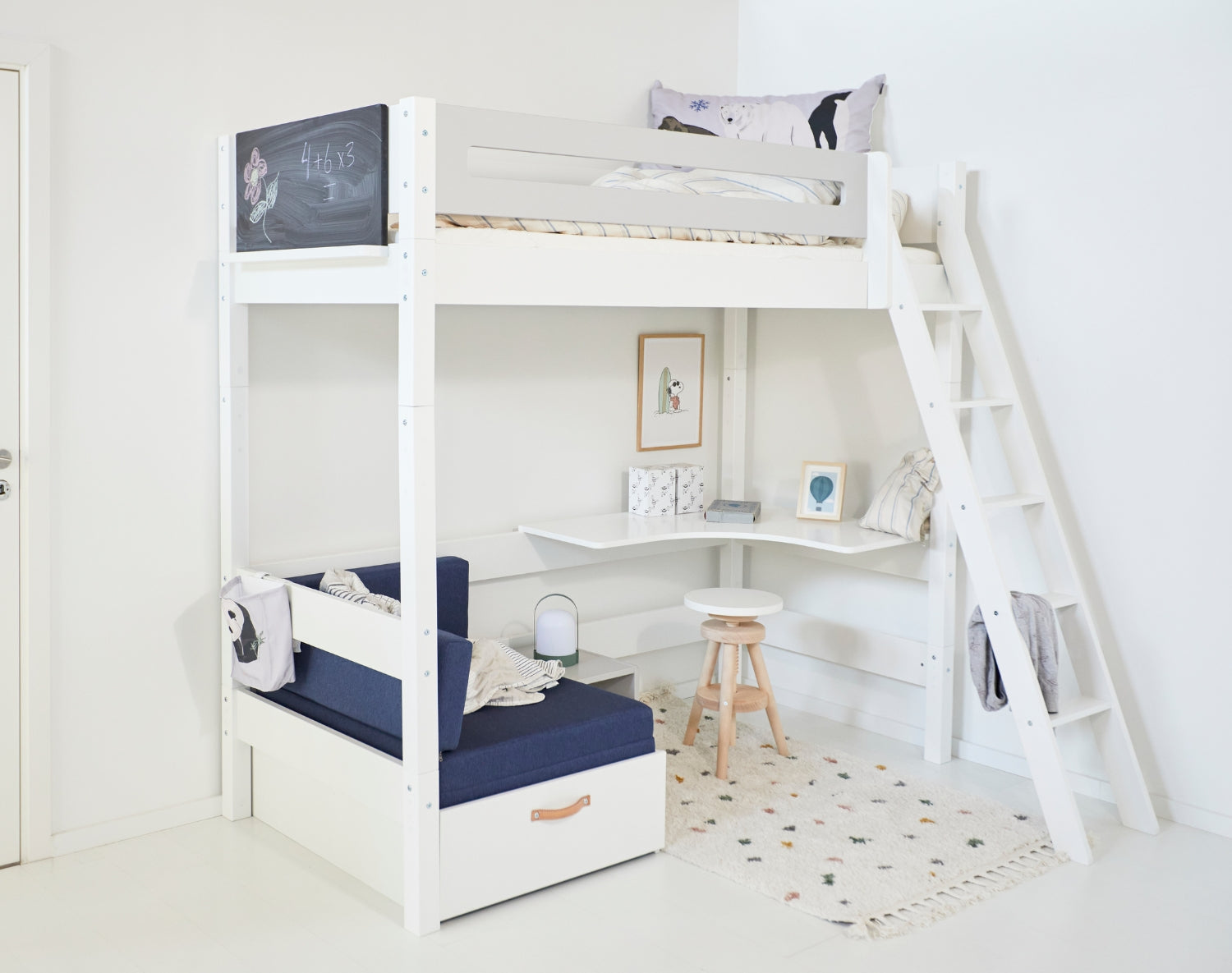 Dieses praktische Ausziehsofa passt perfekt unter ein Hochbett und schafft im Handumdrehen eine gemütliche Ecke zum Spielen, Entspannen oder Lesen. Es kann auch als Gästebett für Freunde oder Geschwister dienen, die über Nacht bleiben.